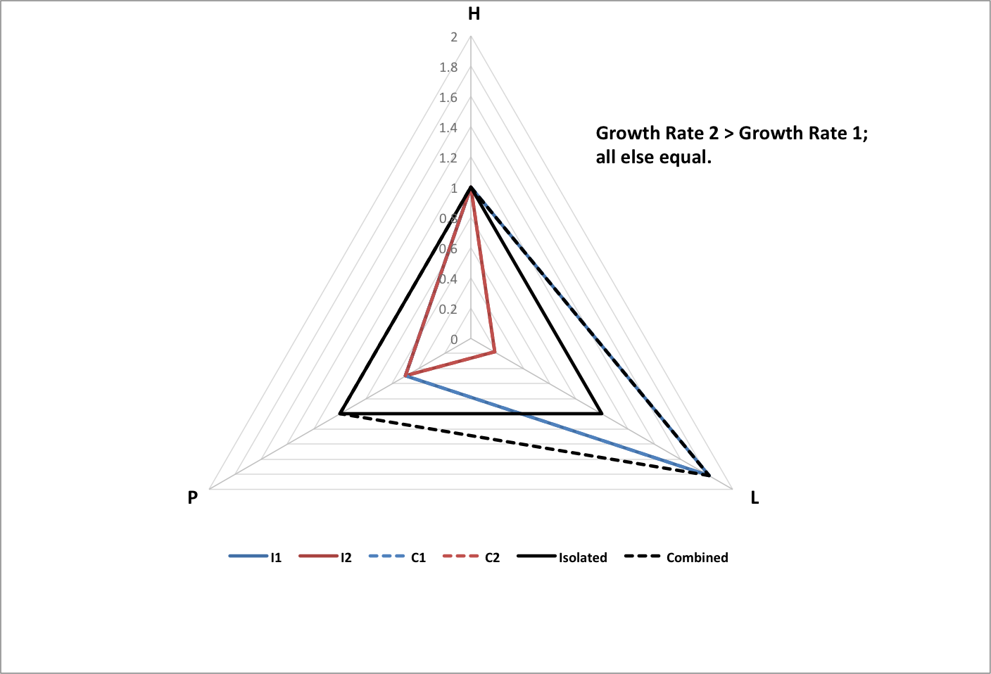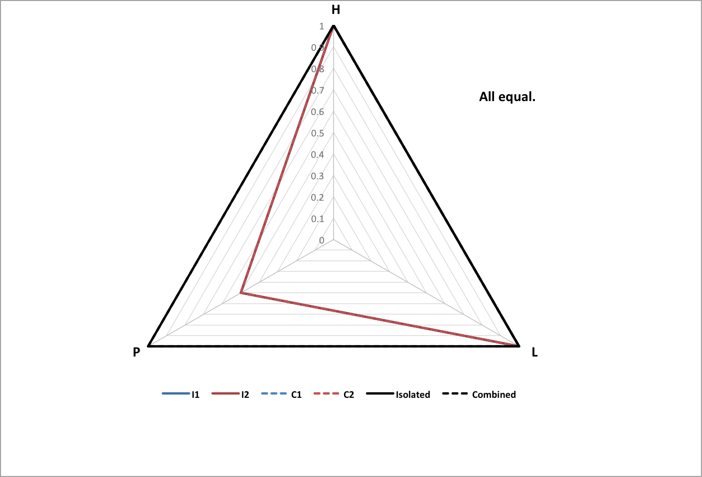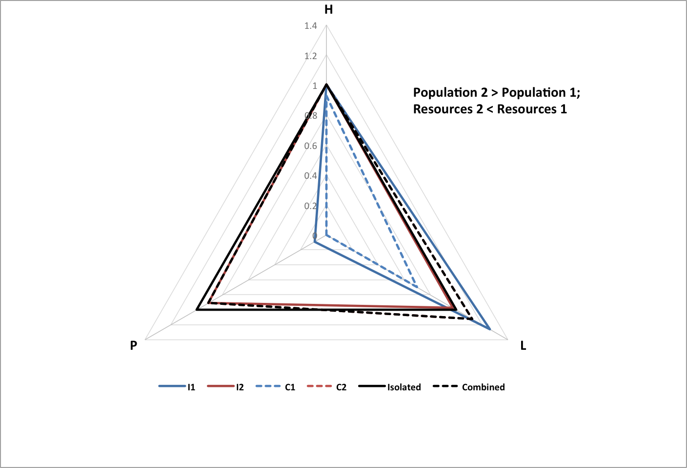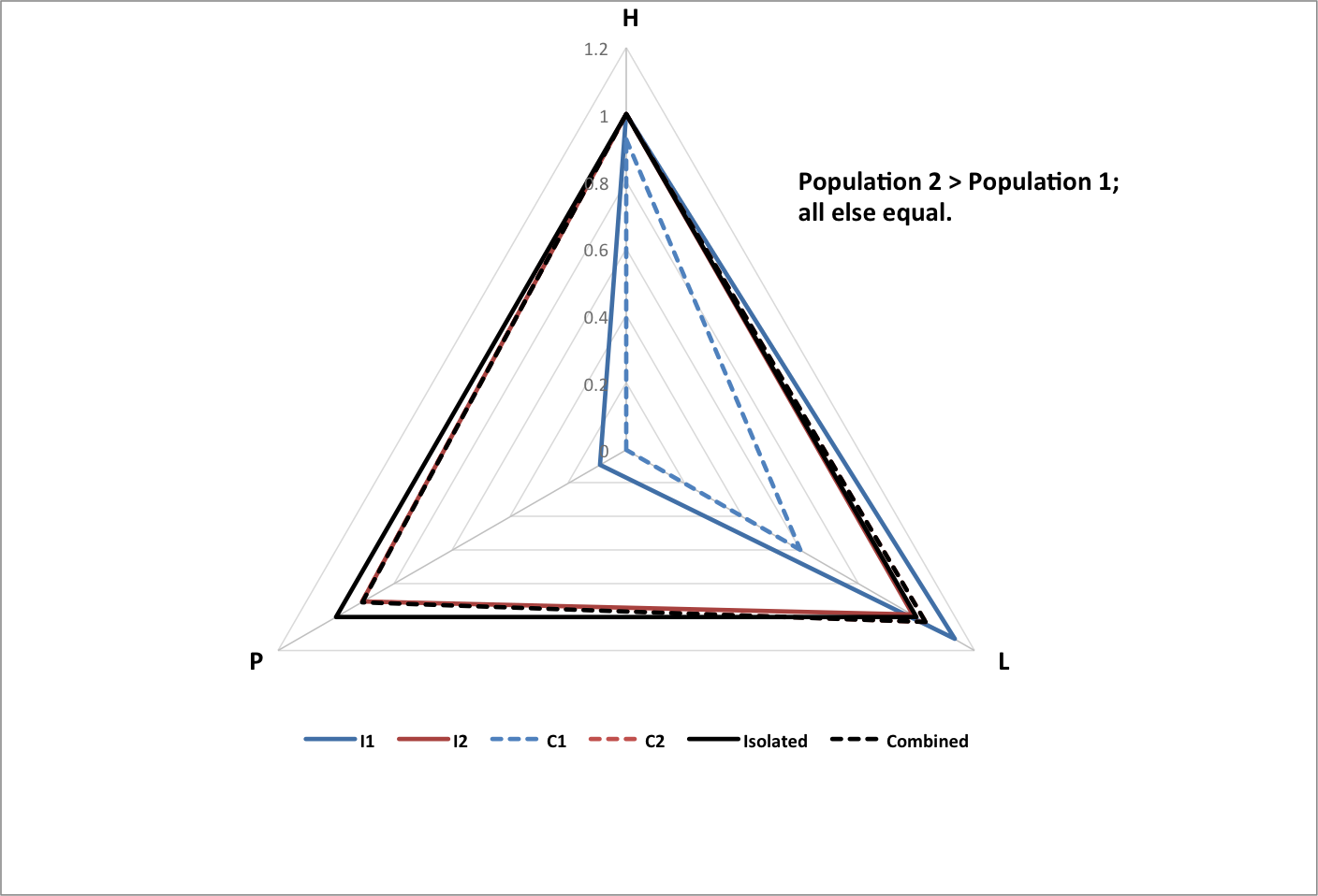 The following graph shows happiness (H), longevity (L), and population (P) for groups of each type, normalized to historical values. Each group consists of the same set of 3000 subgroups with random values within variable ranges chosen so that the All group matches historical data. |