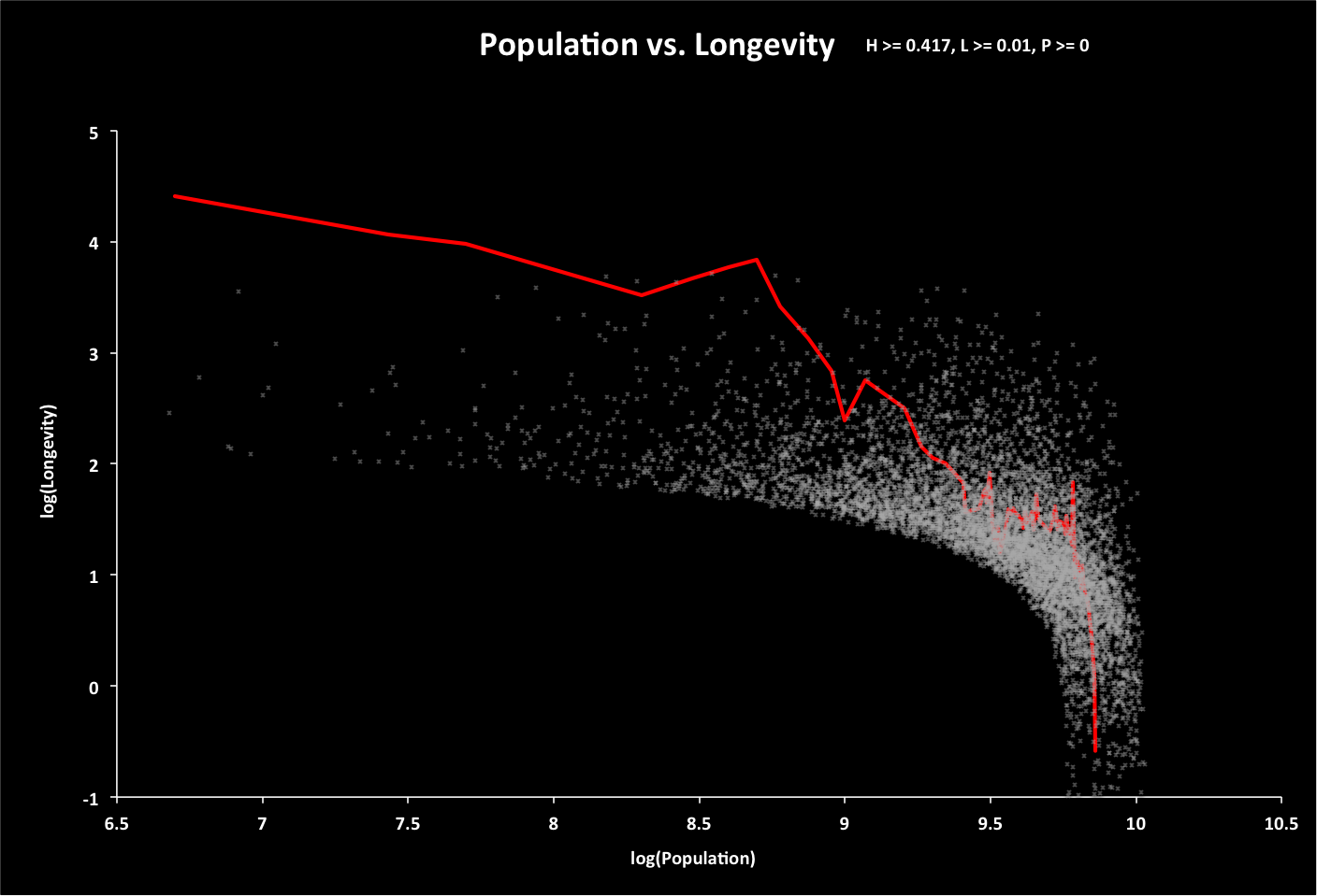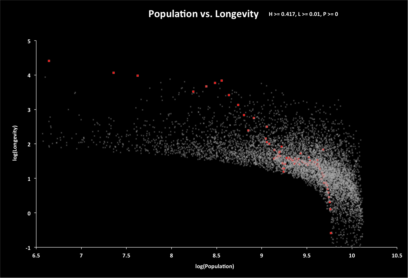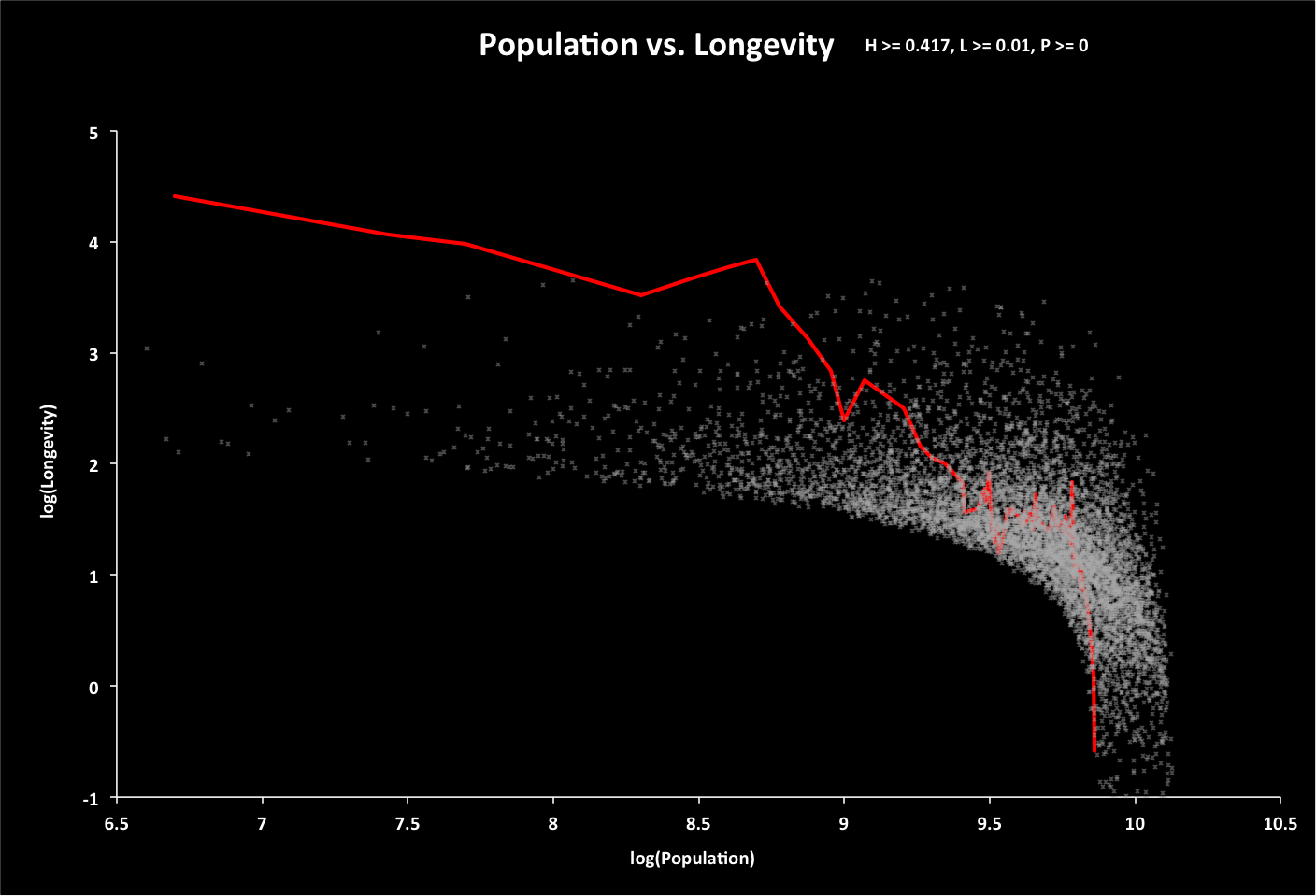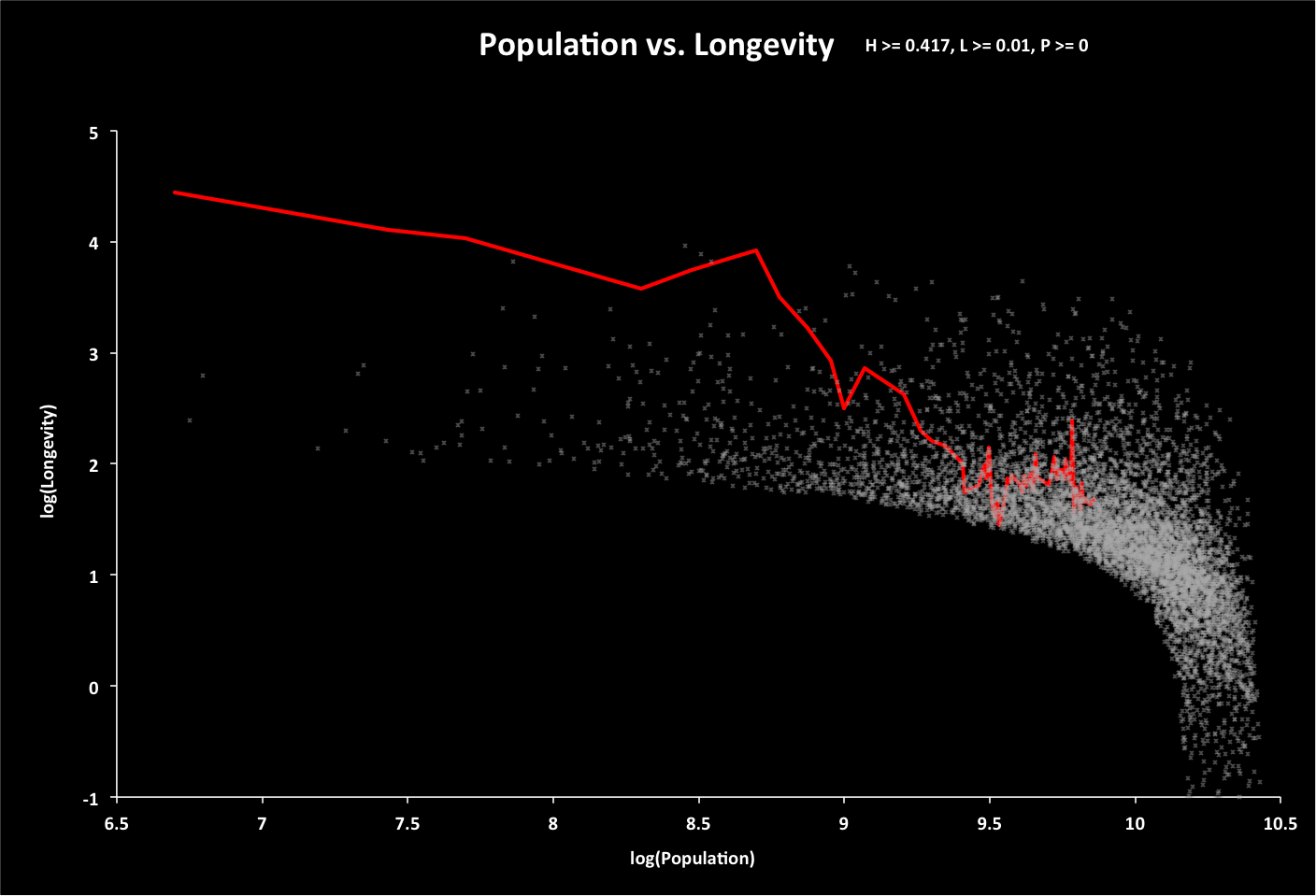 For each point in the sample, a random value is chosen for population, and longevity calculated based on a randomly selected growth rate (annual change in the sum of global ecological footprint and twice the minimum global footprint - population times minimum footprint per person Fmin). If longevity is less than zero, then the population is recalculated for a longevity of zero. The following graph displays population vs. longevity (using base-10 logarithm scales) for all options (data points) with longevity greater than 0.01 year. The red line represents historical data, with time progressing from left to right and years 5000 BC to 2015 AD. Roll over this and the following graphs for related summaries of the data. |
