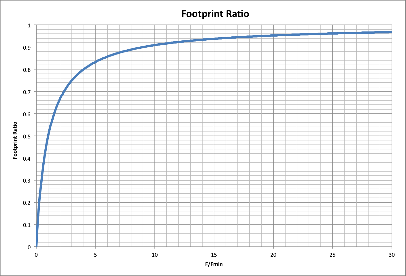 | Happiness h is proportional to the "footprint ratio" Fratio = f / (f + 1), where f is the average individual ecological footprint in units of its minimum value Fmin (that is, f = F / Fmin, where F is the footpint in Earths/year). As f increases, the footprint ratio approaches, but never reaches 1, as shown below: |