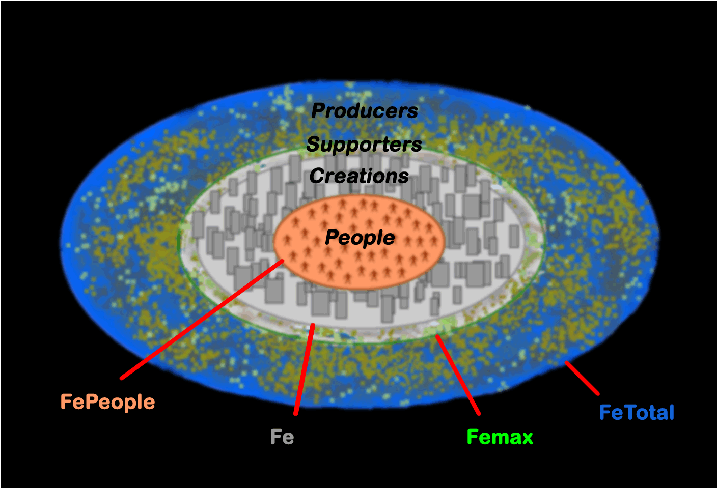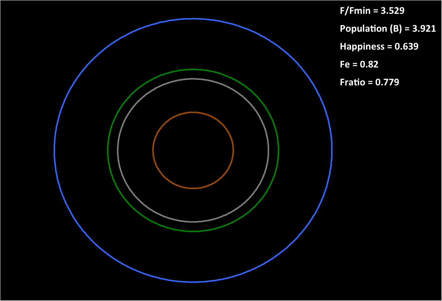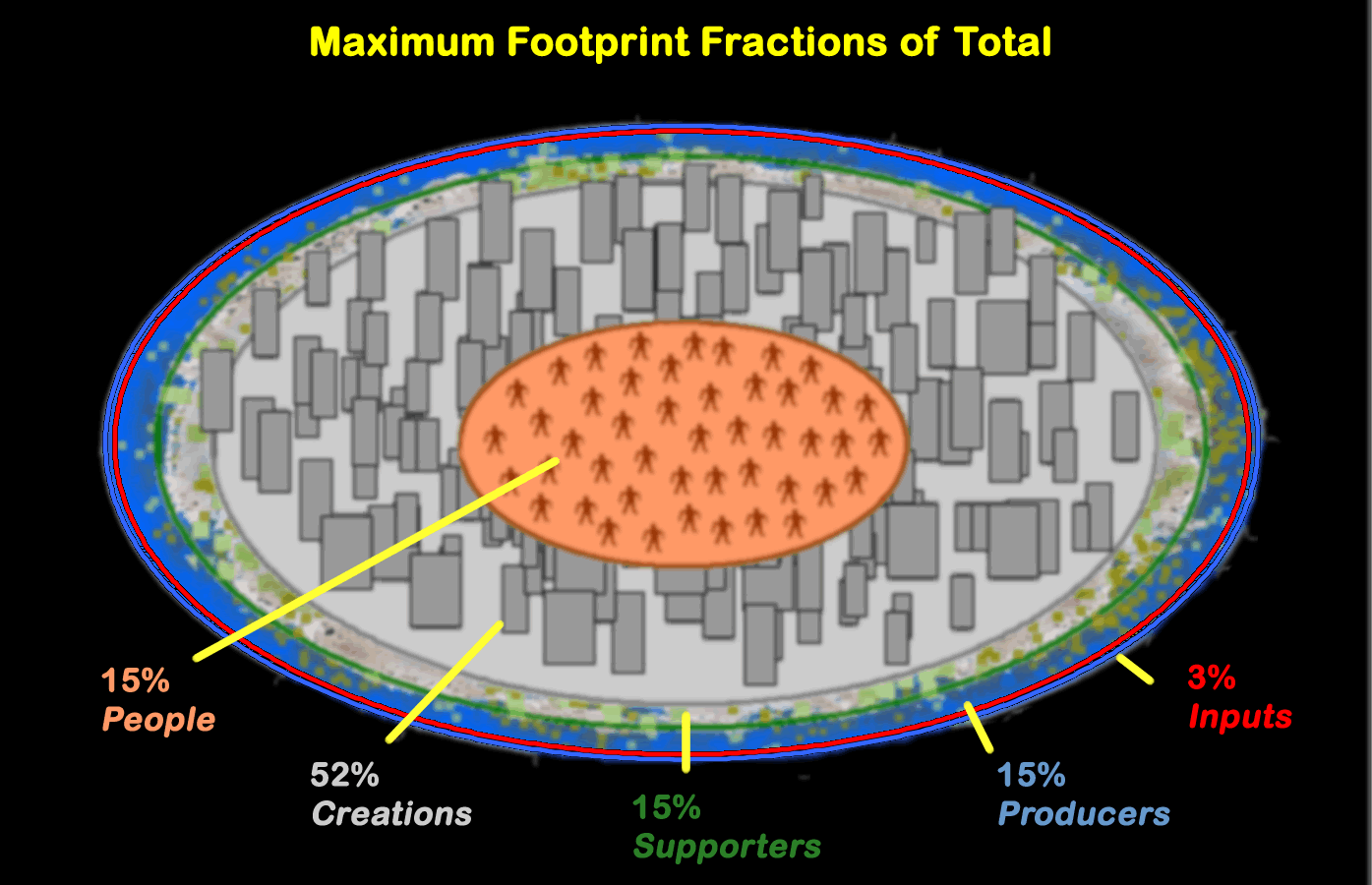 | The following illustration shows each area as a fraction of the total at Fratio = 0.82. It assumes that the supporters require an amount of resources equal to their footprint (just as people do in their natural state), and that the remainder (from the red circle out to the edge) provides resources that keep everything else operating, perhaps as inputs: |