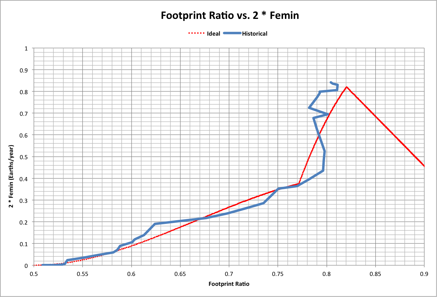 The "global footprint" Fe is the sum of the ecological footprints of everyone on Earth (population Ppop), which includes the minimum footprint of the population (FePeople = Ppop * Fmin): Fe = Ppop * F The "maximum global footprint" Femax is the total footprint plus the total footprint (Femin) of the part of Nature associated with the minimum footprint (that which provides what we need to survive): Femax = Fe / Fratio = Ppop * (F + Fmin) = Fe + Femin Using the Living Planet Index as a proxy for the total footprint available on Earth, FeTotal = 2.783 Earths/year, and the ratio of Fe to FeTotal is the fraction of the total used by humanity and what it requires for survival. This Femax ratio is graphed below as a function of the footprint ratio, using historical data for the years 10000 B.C. to 2013 A.D. |