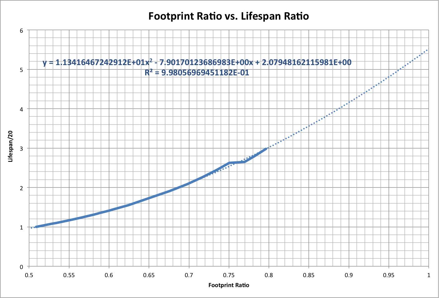 Note also that life expectancy varies with footprint ratio as a second-order polynomial, as shown below. The initial image is a projection using data up to 1970 (Fe ~ U). Roll over the image to see a projection for the full data set, out to Fratio = 1, using a sixth-order polynomial. The first projection yields a maximum life expectancy, at Fratio =1, of 5.5 times the minimum (110 years). The second projection shows that the life expectancy peaks at 71 for Fratio = 0.82 and drops to zero by Fratio = 0.89. |