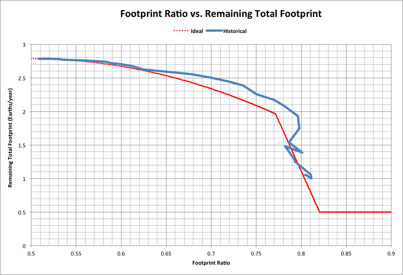 At Fratio = 0.82, the remaining total footprint FeTotal - Femax = 0.5. The following graph shows this value as calculated by the curve fit (Ideal) and using historical numbers: |