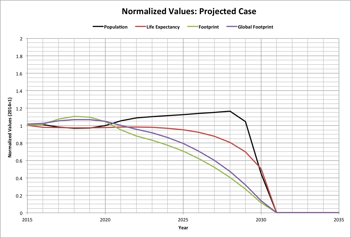 | The following graph shows how key variables could change based on the projections, normalized to values in 2014. In this case, a projected Femin (see roll-over image) would be multipled by Remaining Femin when Remaining Femin is less than 1, then resume its trajectory afterward. |