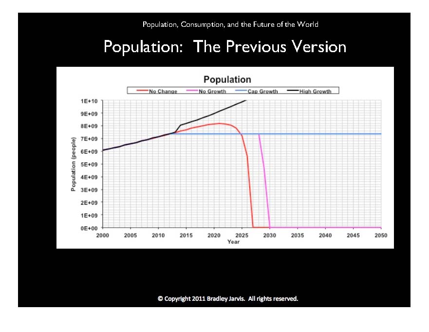 Because the near-constant footprint as a function of population made no sense, I assumed that the Old Footprint data was most accurate for my purposes. I projected population backward and forward in time, and per capita consumption tracked with it. I constructed an elaborate model based on fixed total resources that led me to believe that the world population would crash within the next 20 years. The scenarios shown here are the main alternatives I considered. "High Growth" would involve getting more resources, almost certainly from space. If we just stopped increased our consumption ("No Growth") our resources would just last a little longer. The solution I settled on ("Cap Growth") involved holding consumption constant, to avoid loss of population, and increasing the use of renewable resources as fast as possible until they accounted for all of our consumption.