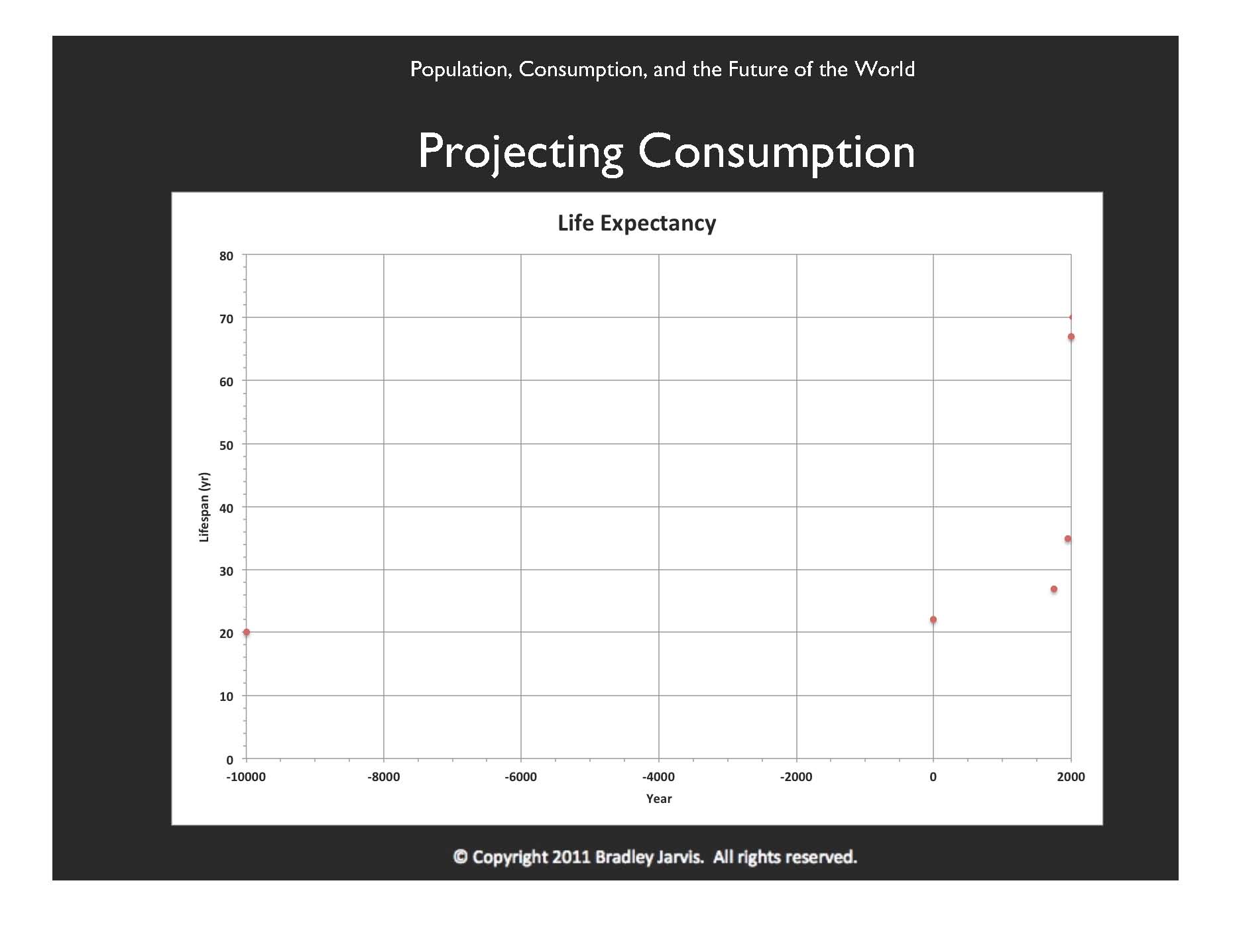 While preparing this presentation, I revisited my assumption about the relationship between population and per capita consumption. While I knew of no direct estimates of early ecological footprint by others, I could find estimates of life expectancy, which, together with the logarithmic relationship between it and the footprint, could be used to calculate the footprint for historical population values which others had also estimated. The red dots in this graph are estimates of life expectancy that I found. Those until 1950 are from the book A Concise History of World Population.