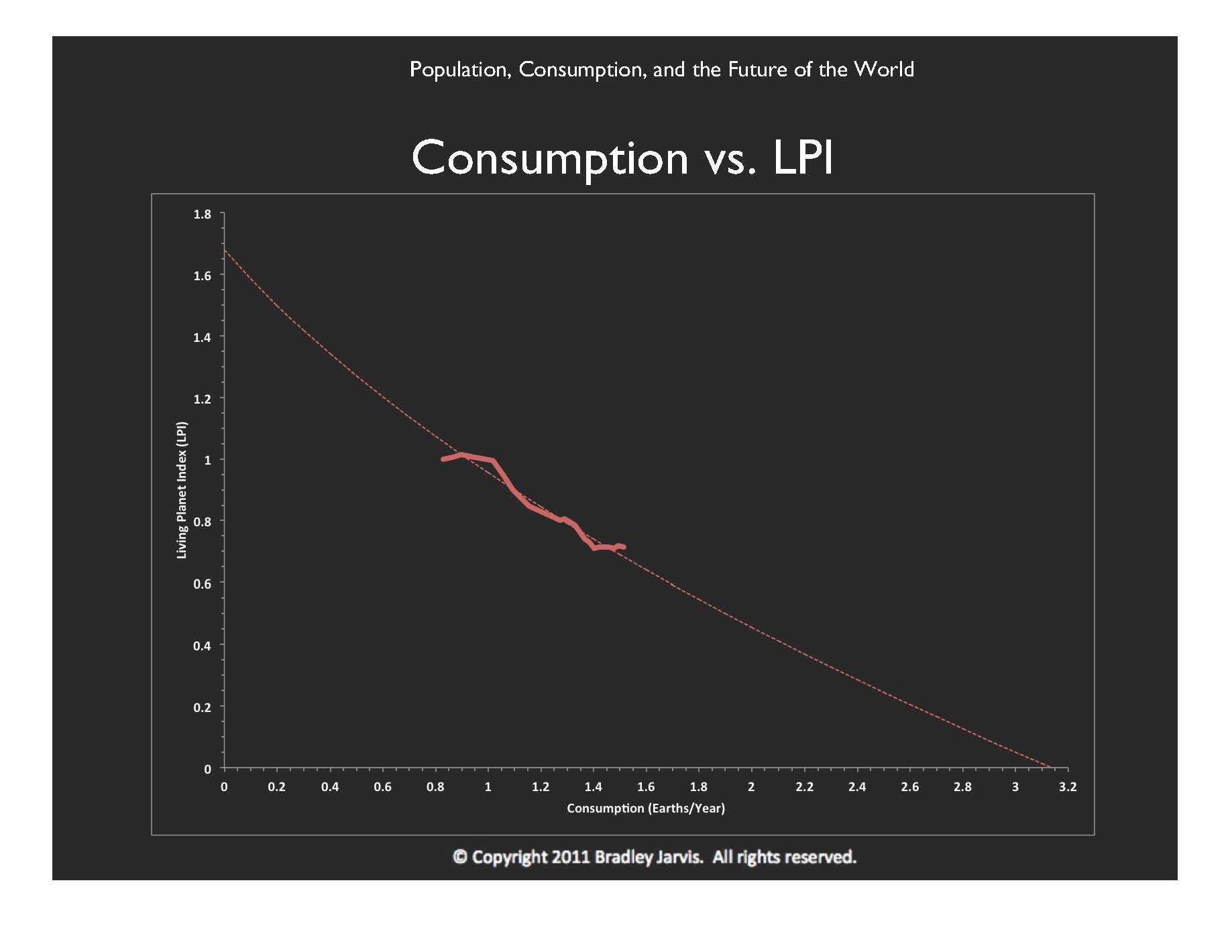 Here is a graph of the Living Planet Index as a function of consumption. The curve fit, shown as a dotted line, assumes that other species have their own transaction and extraction masses, and that the total amount of resources available each year on Earth is the sum of what they consume and what we consume. If this assumption is true, then the point on the graph where the LPI reaches zero is where we will be consuming all of the resources. Put another way, the total amount of resources is about 3.1 Earths. It is almost certain that those species are perfoming a number of important services to keep our planet habitable. When they are not around to do so, then I consider it highly probable that we won't be able to survive either. Notice that where our consumption is zero, the LPI is about 1 2/3. If the LPI can be generalized back through time, then that means we have probably decreased the populations of other species by 61% so far.