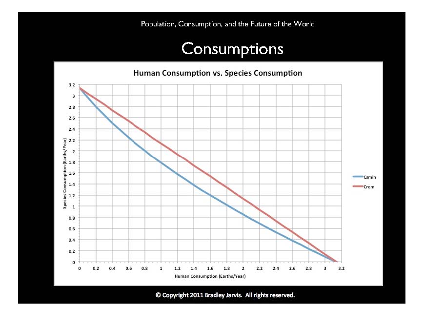 Knowing the total resources, the consumption by other species will be that total minus our consumption. The red line shows what other species are consuming as a function of what we are consuming. Recall that if we consumed nothing, the LPI would be 1 2/3 and other species would be consuming the total. If we divide the total by that LPI, it gives us an estimate of the consumption per unit of LPI where species are just supporting themselves. If other species don't waste anything, unlike us, then they will still be consuming that same amount to maintain themselves, and anything extra will be used to deal with new conditions, such as finding less plentiful food and fighting each other for it. That's the basis of the blue line, which shows the amount of consumption for creatures just meeting their basic needs; the difference between that and the red line is the extra they are consuming so they can get it. If those other species are responsible for one Earth per year of resources that's renewable and we all depend on, then what will happen when their total consumption falls below one Earth per year? Can they produce less than they consume? We'll learn the answer, when, as the blue line reaches one Earth, our consumption hits 1.8 Earths per year.