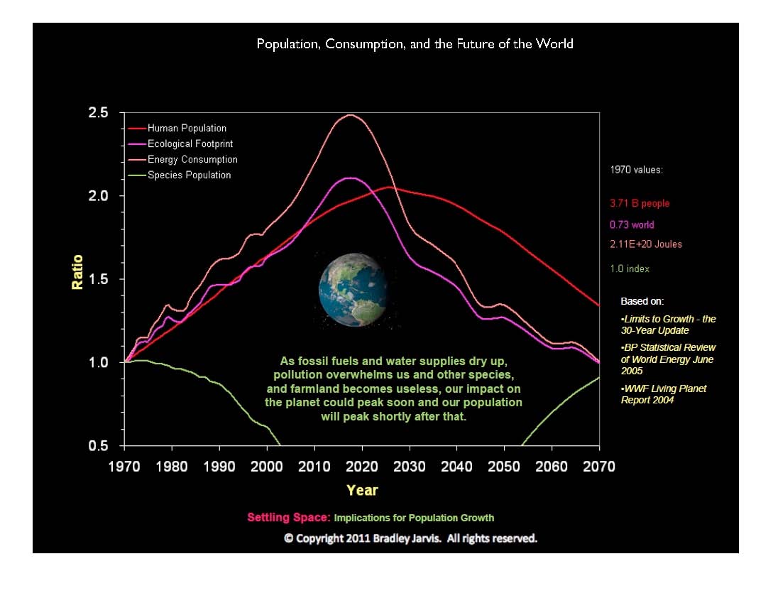 Here is a close-up, again from the Settling Space presentation. It shows a number of other variables in addition to population, normalized to the values they had in 1970. Normalization, you may recall, is a way of comparing data that have different units, as a fraction of what they were with the same value of some related variable (such as time). Note in particular the world population projection, which is based on the "business as usual" scenario in the book Limits to Growth: The 30-Year Update. That book is by famous "Club of Rome" authors who did the first systems analysis of humanity's resource consumption in the 1970s, showing that we are limiting our own future by excess consumption. In many respects, my own work on the subject has been an attempt to test that idea, albeit in a much more simplistic way. Also shown is a projection of the Living Planet Index (LPI), a measure of the populations of other species which I'll discuss later. The LPI has changed in its definition since the data used in this graph, but this clearly illustrates the quite significant negative impact we have had on the rest of the biosphere.