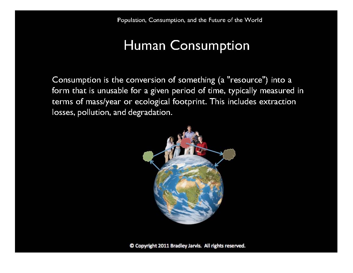 I define "consumption" as shown. What we consume starts as a "resource," is "used," and then becomes "waste." Some waste can be recycled and reused, while some of it cannot (at least within a meaningful period of time). The physical law of entropy demands that disorder always increase in a closed system (which our planet almost is, and our Universe certainly is). Other species have done an excellent job of reducing the increase in disorder by reusing almost everything, including evolving to use or reuse what can't currently can't be. Since at least the beginning of civilization, and certainly most recently, we humans have attempted to ignore this law, increasing the time that waste remains waste, unusable and even harmful to other species and us.