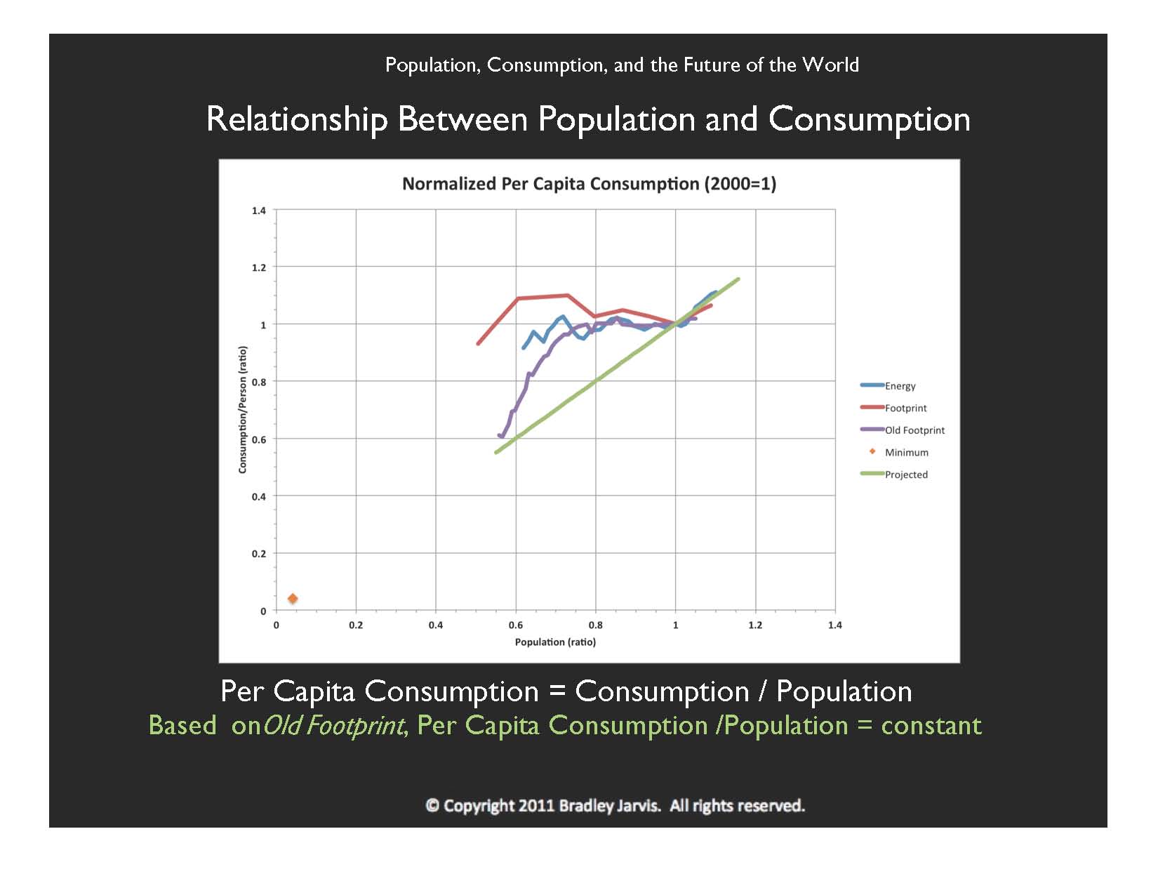 This graph shows how world per capita consumption (the average consumption per person) varies with population, normalized to their values in the year 2000. There are two sets of ecological footprint data: The "Old Footprint" uses the definition of ecological footprint as it existed in 2006, and "Footprint" uses the current definition. "Energy" is world energy consumption. (See my Web site for sources and details.) Based on the Old Footprint, per capita consumption is proportional to population, as indicated by the straight line. I used this for my projections of population and consumption until very recently. The orange dot near the bottom-left corner shows what I considered to be the minimum footprint. The current data shows that per capita consumption appears constant, or not dependent on population at all. If we projected Footprint and Energy back toward zero population, we would be led to believe the total nonsense that, before civilization, people consumed as much as we do today.