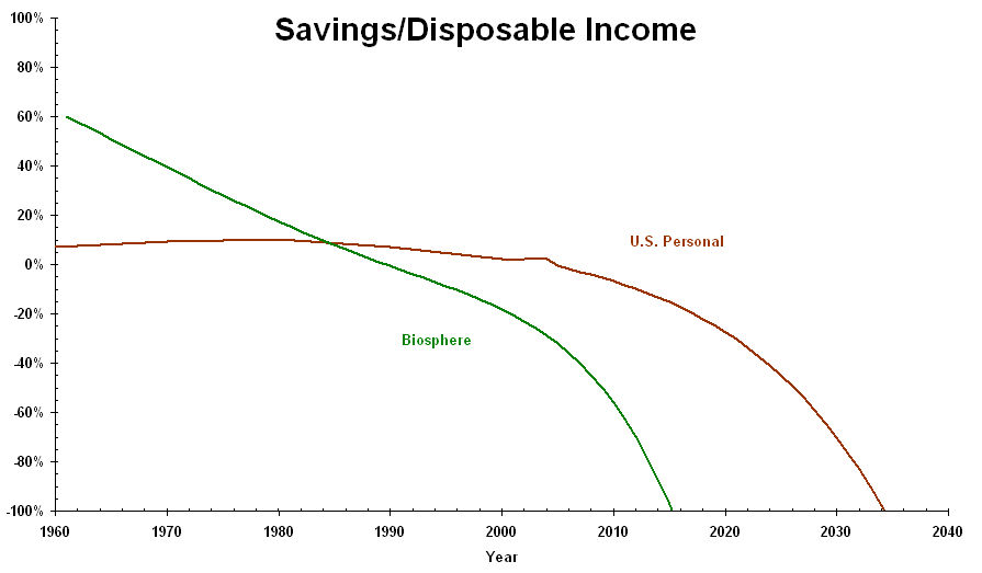 Crisis of Debt In 2000, average American workers, who comprised about half the nation's population (half of the non-workers being children), annually spent half their time (after eating and sleeping) in work-related activities (including commuting). Since 2005, Americans have spent more money than their disposable income. Debt will exceed disposable income in less than 30 years if current trends continue (not counting the growing government debt, which Americans are all responsible for). Economically, American workers would become slaves, because no one would extend them any more credit and they would have to spend all their previously “free” time paying back what they took. Even if every American (children included) started working at that point, debt would once again equal disposable income in another ten years. Humanity's ecological prospects mirror the American worker's economic prospects, and the time frames are remarkably similar. Nature's economy, the Earth's biosphere, uses the equivalent of human barter: over the course of their lifetimes, members of species trade goods and services rather than money (“goods” are created and then recycled from renewable resources, using energy from the Sun). Because there is no natural equivalent of money, credit – any agreement to trade equivalent goods or services in the future for goods or services received in the present – is on the honor system. Humanity has attempted to bypass this system by extracting non-renewable resources and creating goods that cannot be recycled by the biosphere (from the biosphere's perspective, they are by definition “waste”). We have also denied the biosphere the use of our own matter to recycle and use elsewhere. Our waste began to overwhelm the biosphere around 1989, analogous to the point where American workers began going into debt. By my estimates, within 30 years from that time the biosphere will be trashed (in every sense of the word), and there will be no way humanity can “earn” enough to pay for what we've taken. The following graph illustrates these trends: For more, see my essay. |