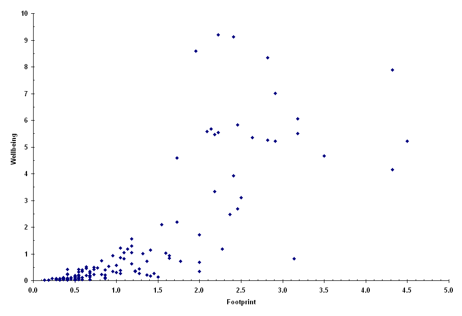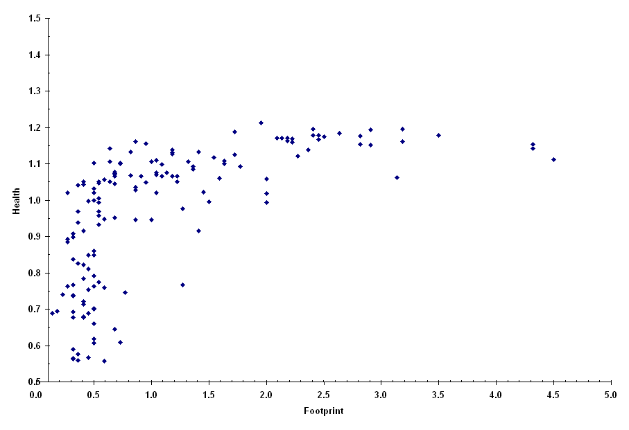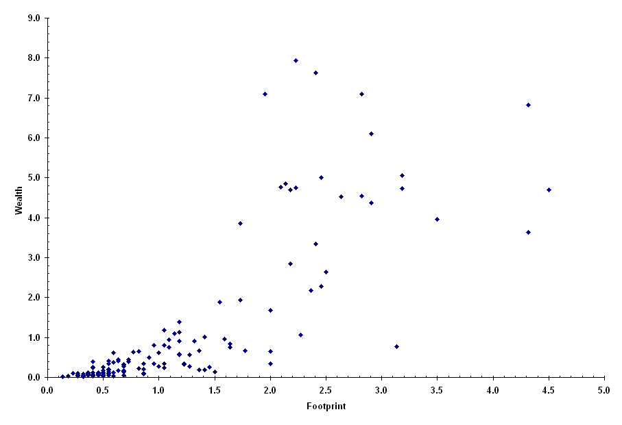Wellbeing What, if any correlation is there between a person's ecological footprint and their wellbeing? The following graphs provide some clues, based on present conditions. Health Here, each country whose global ecological footprint we know is plotted as a point on a graph, where Footprint is a country's global ecological footprint (per person) as a fraction of the world average, and Health is a country's average life expectancy (male and female) as a fraction of the world average. Note that, despite the scatter (variation in value for any given footprint), there seems to be no gain in health for footprints higher than two. Wealth Again, each point represents a country, but here we are plotting wealth as a function of footprint. Wealth is represented by the Gross National Product (GNP) per capita as a fraction of the world average. Notice that the amount of scatter increases dramatically for higher values of footprint. Wellbeing