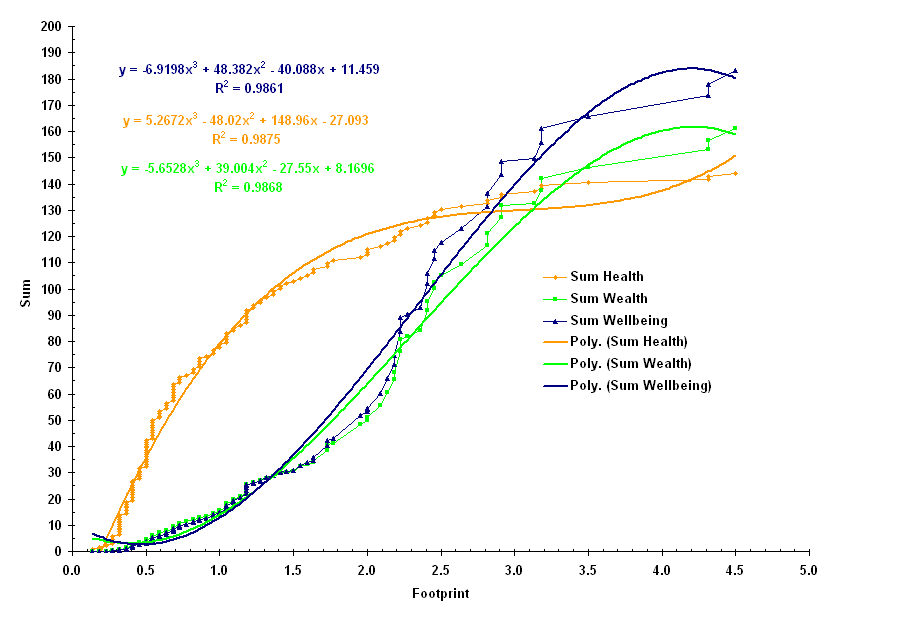 If we multiply health by wealth to represent "wellbeing," the result is shown above. Clearly wealth is dominating health, based on the previous graphs. Following is another way to summarize the information: Here, the contributions of the countries are added together for health, wealth, and wellbeing, in order of increasing footprint. Notice that the form of the curves (represented by the polynomial curve fits) is similar to that of the volume of a sphere as a function of its radius, where volume corresponds to the sum, and radius corresponds to the footprint. See Low Footprint Countries for a comparison of countries living within Earth's ecological means. |