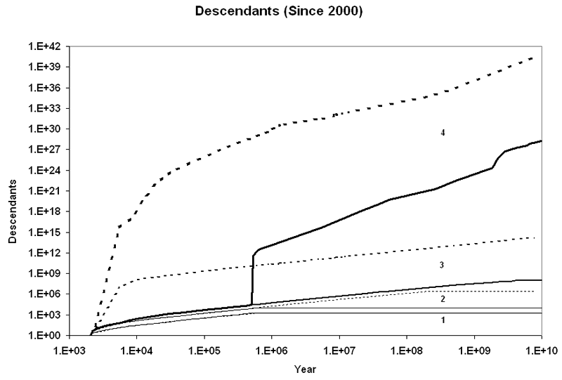 If there was a constant population from now until the death of the Sun, we would have 1E+08 descendants.
