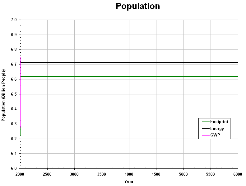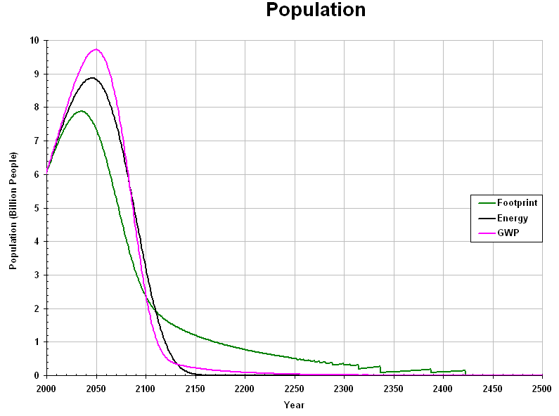 Following is a comparison of the no change (business as usual) scenario with projections from other sources: The "World3" plot is from Scenario 1 in Dennis Meadows, World3-03 global simulation model as presented in Donella Meadows, et. al., Limits to Growth - the 30-Year Update, Chelsea Green Press, White River Junction, VT, 2004. The "Census" plot is from the U.S. Census Bureau, as quoted in The World Almanac and Book of Facts 2008, World Almanac Education Group, NY, NY, 2007.