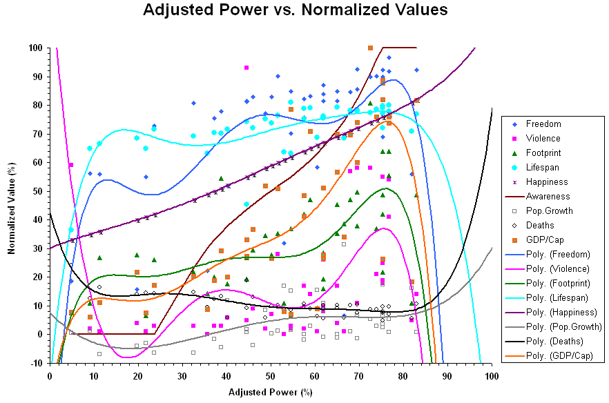 We can set ranges of power and intelligence for the population and randomly assign values of power and intelligence to each member of the population. For ease of analysis, we can combine the ranges of power and intelligence into a single variable called "adjusted power." Adjusted power starts with no power and ends with maximum power and (positive) intelligence. From 0 to 25% of the maximum, intelligence is entirely negative; from 25% to 75% intelligence is a mix of negative and positive, and from 75% to 100% intelligence is entirely positive. Happiness and Adjusted Power People's satisfaction with their lives has been measured in various countries. This "happiness" can be modelled in the simulated population (specifically, it is the ratio two numbers: the distance between a person's final position and the furthest point they can go from their preferred position, and the distance between their preferred position and that furthest point). Happiness varies measurably with adjusted power, so from happiness we can derive the associated adjusted power. There are clear correlations between happiness and such real variables as freedom, life expectancy, per capita ecological footprint, per capita violence, and population growth (these are described in Happiness). We can therefore see how these variables change with adjusted power. We can also see how the fraction of the population that has positive intelligence (what I call "awareness") varies by country. This data is summarized below for a sample of 43 countries for which all the statistics are available, and includes statistical curve fits to the data that extend beyond the data's limit to 100% adjusted power. For definitions (of all but "awareness") and references, see Happiness. For calculations, download the spreadsheet. Data is listed below, in order of decreasing adjusted power.