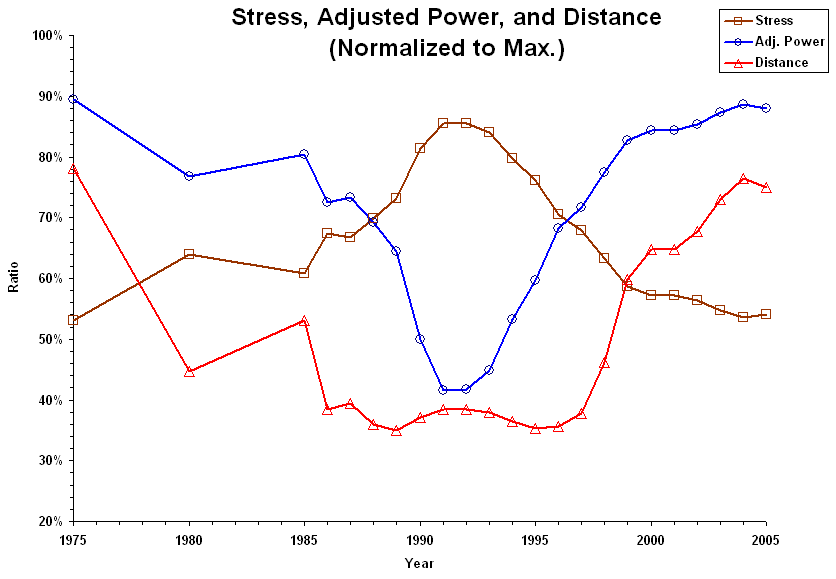 Stress and Crime - Version 1 Assuming that violent crime is perpetrated by the part of a population whose stress is greater than one standard deviation away from the average, the following graph shows the relationship between the violent crime rate (with an average lifespan of 77 years) and lifetime average stress, adjusted power, murder crime rate, and total distance traveled: With these relationships, we can see how average stress, adjusted power, and distance have varied over history: