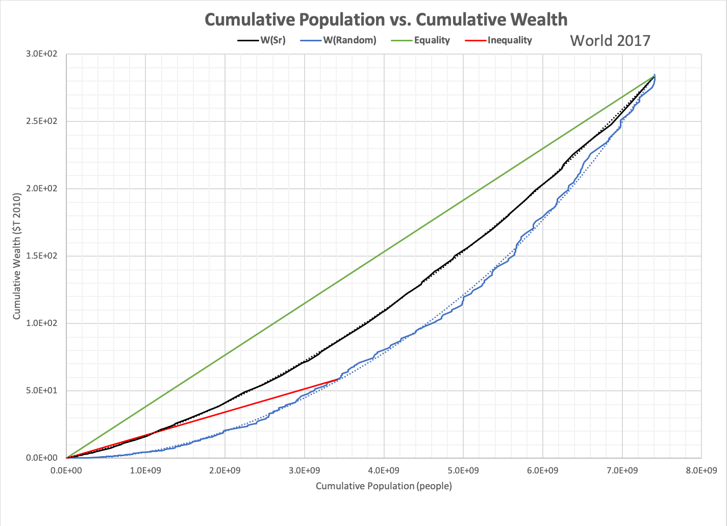 Note that regions with no people are not shown. In this simulation, 60 of the 300 are uninhabited with no remaining resources. While wealth inequality is roughly indicated by the distribution of regions for Wealth/p, it can also be measured using a graph of cumulative population vs. cumulative wealth as shown below for the world in 2017. The graph shows how wealth per person depends on how it is grown in a chain of regions, each with its own population and consumption. Since wealth varies with population times total consumption (resources traded between all people) - roll over the graph to see how - the distribution of consumption throughout the chain has the most impact on inequality. Three examples of wealth distribution are shown. The green line indicates pure equality (everyone has the same amount of wealth). The black line indicates how wealth would be distributed if the chain was organized based on population/nature. The blue line indicates a random chain (this chain best matches historical data). A red line is drawn to the point of average difference between the curve and the equality line, indicating an angle that can be used to measure inequality, where [angle of green line to the x-axis]/ [angle of the red line to the x-axis] = inequality. |