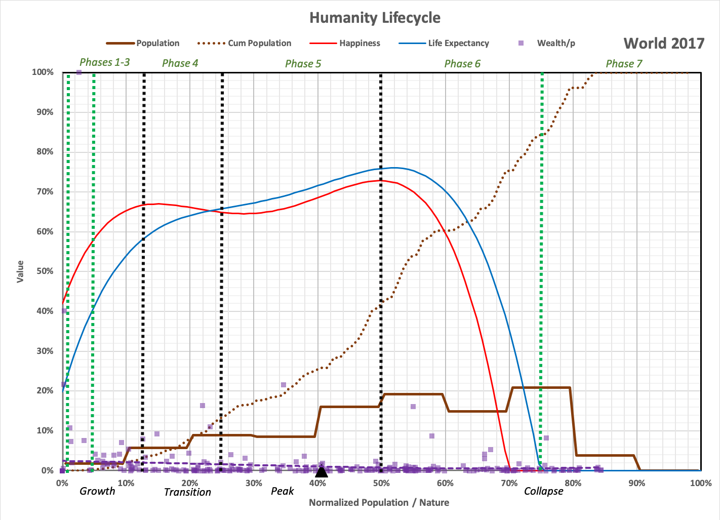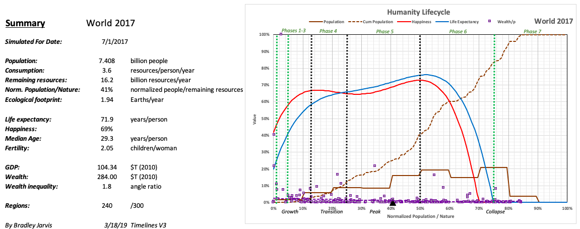 Black dotted lines indicate where "stages" of development are crossed in what can historically be considered as humanity's lifecycle. These stages are defined as ranges of Sr below, along with "phases" of development based on history and the best fit to the future (Timeline 2). The number of people in each phase is simulated using 300 regions defined by randomly selected values for P, Rs, and Rtotal. One such simulation is shown below for the world in 2017, indicating the distribution of population and Wealth/p for each region (normalized to the maximum). A curve fit toWealth/p (dashed purple line) is also shown., along with theoretical values of happiness and life expectancy. A black triangle on the horizontal axis indicates the average value of Sr for the population. |