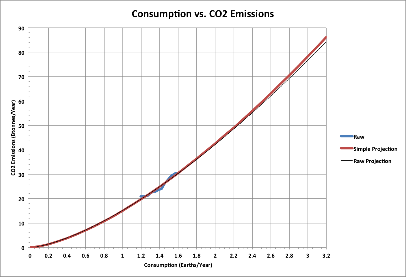 Carbon dioxide emissions appear to vary exponentially with consumption. Here: