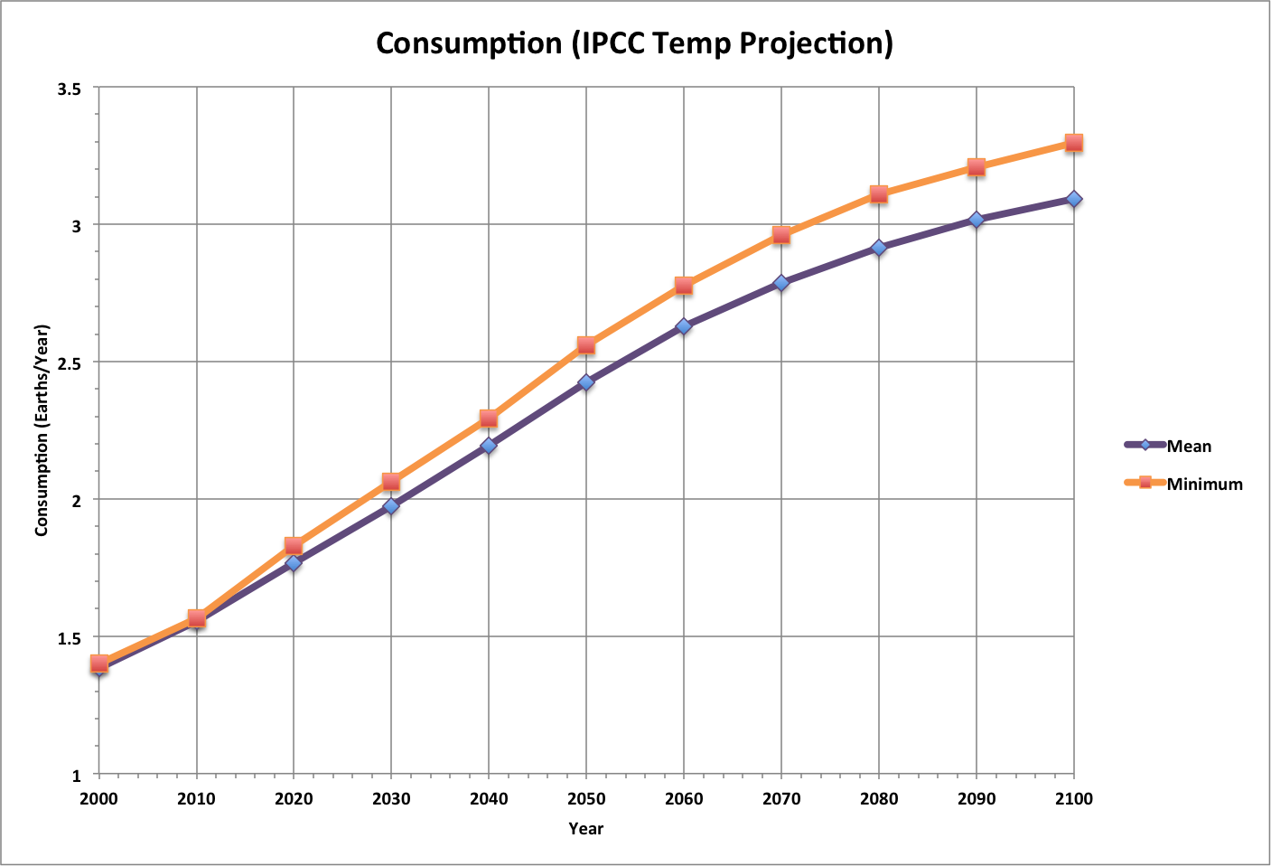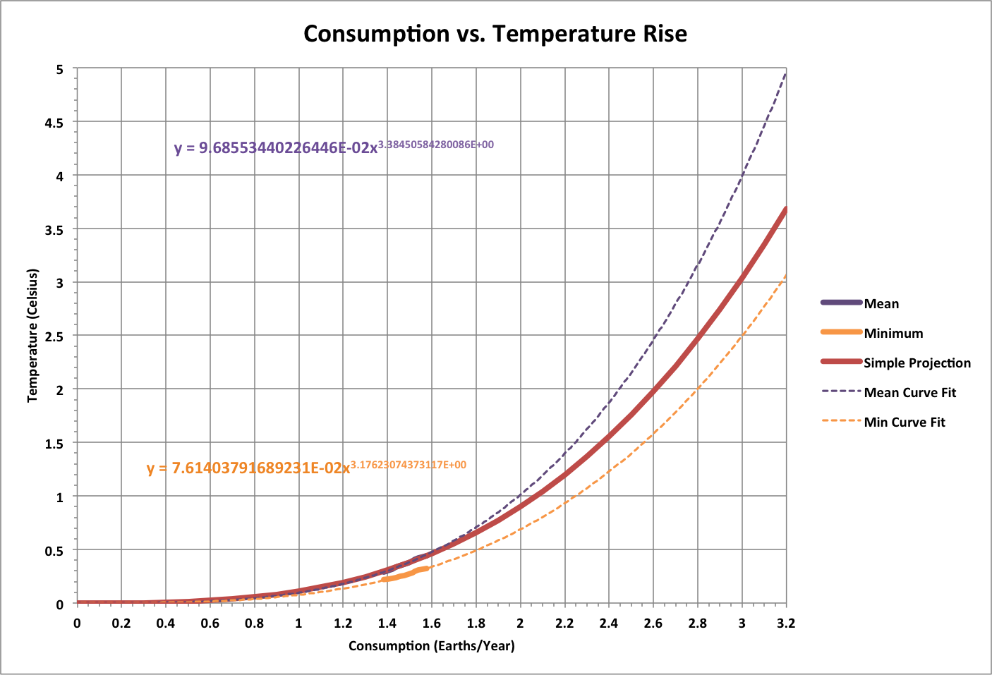 Temperature above the preindustrial level also varies exponentially with consumption. Here, the minimum and mean IPCC projections are curve fit to consumption. In addition, Simple Projection uses an exponent of 3 to match the mean temperature: