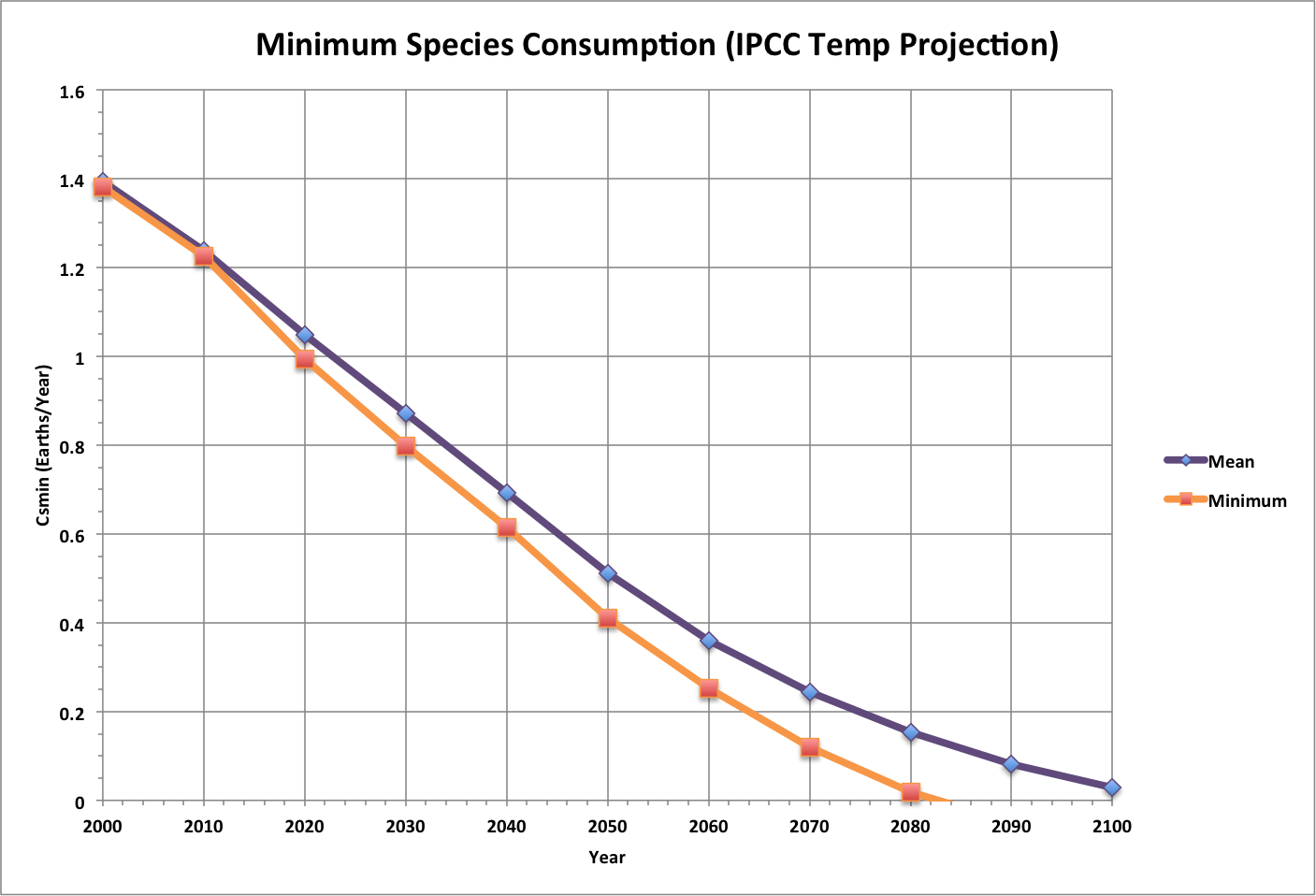 The minimum species consumption for the IPCC projection confirms that habitability will be compromised (Csmin < 1) in the range that as beyond adaptability for us and other species.