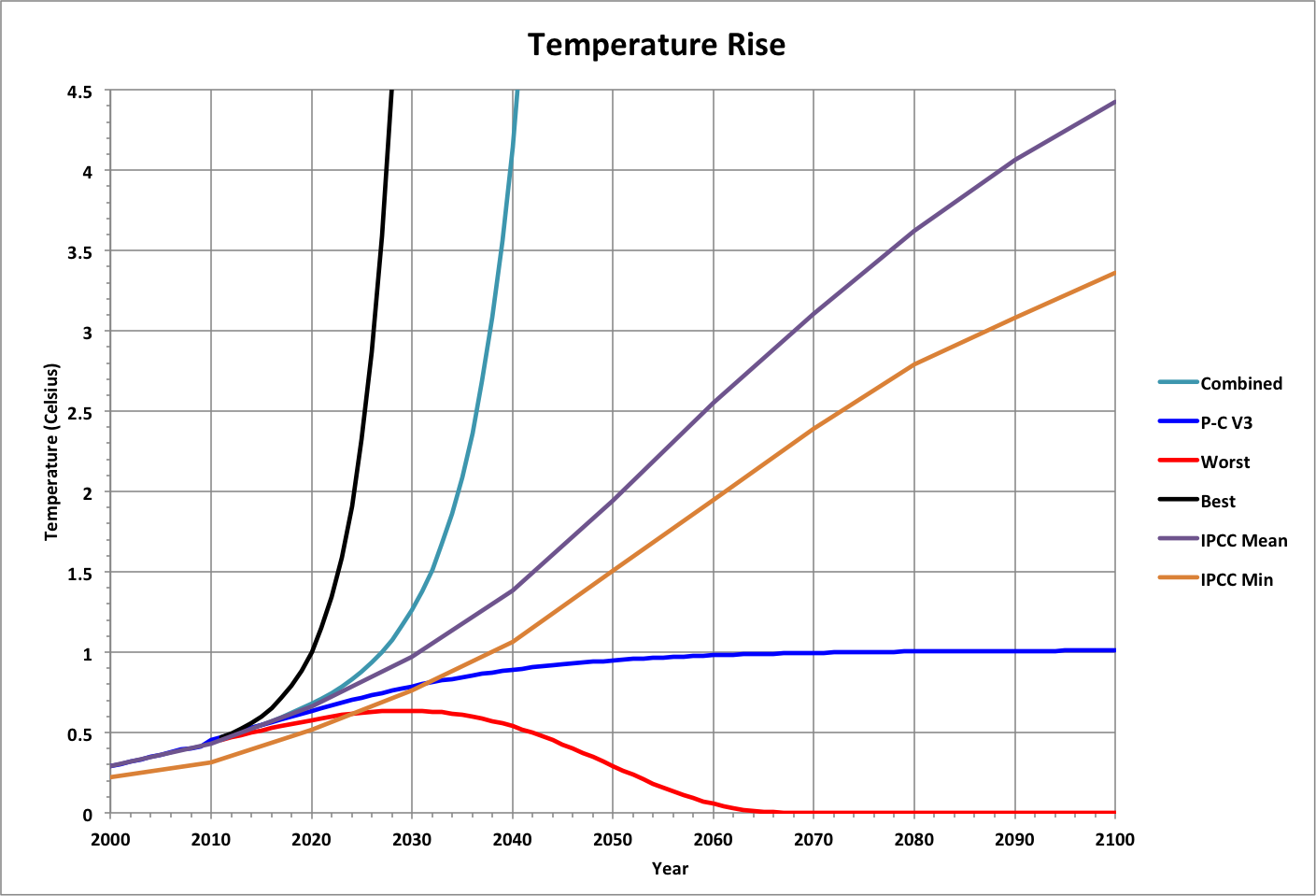 Temperature is plotted over time for each of the scenarios used in Compared Projections, based on the mean IPCC projection's relationship to consumption. Note that persistence of emissions and feedback could cause it increase even as consumption decreases (in Worst, which is considered the most likely scenario).