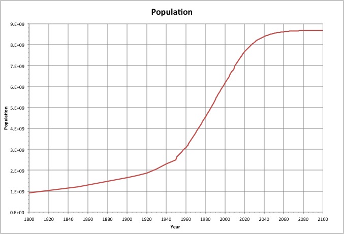 Assuming current conditions can be maintained (extraction mass Me stays at its current value – energy and other resources can support it; and the maximum consumption Cmax doesn't decrease), the population will approach the maximum (Pmax = 8.69E+09) and stay there.