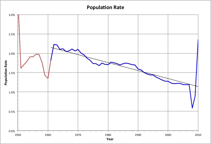 The rate of population change has declined linearly since the 1960s. If this trend were to continue, the rate would reach zero (the population would peak) in 2065 and consumption of ecological resources would be the equivalent of 2.1 Earths.