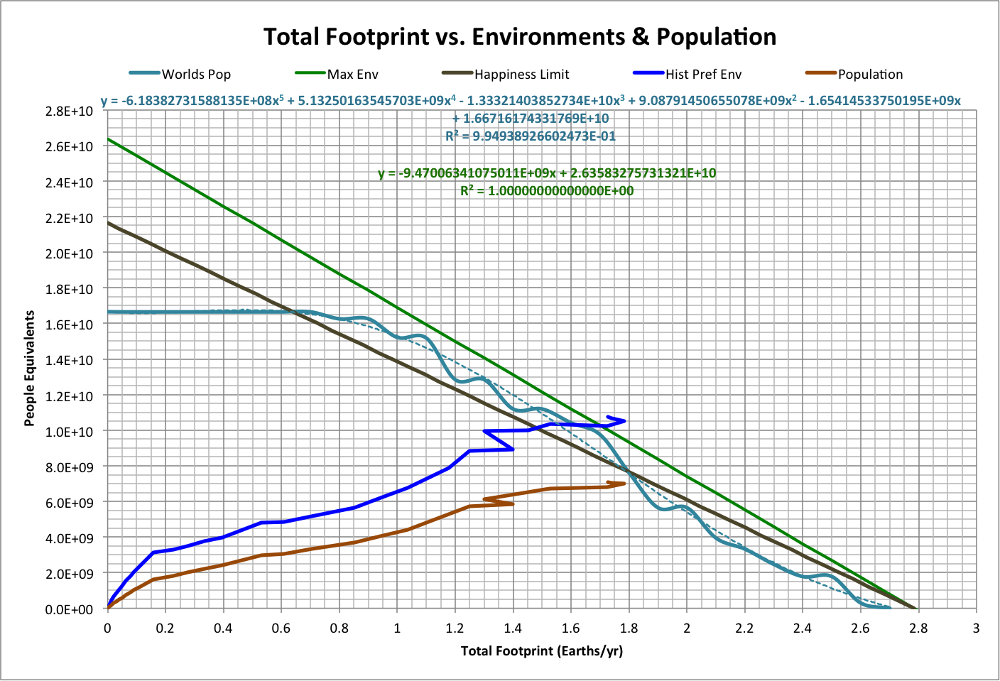 Note that the putative population peak occurs close to where Worlds Pop intersects Happiness Limit. Roll over the image to see a projection of population beyond 2013: it approaches the limit, moves away, and approaches again, in an infinite set of oscillations ("popscillation"). This projection is based on a simulation starting in 2013, where the Pop Center is targeted and the speed follows the curve fit of speed to distance from the Hab Center. |