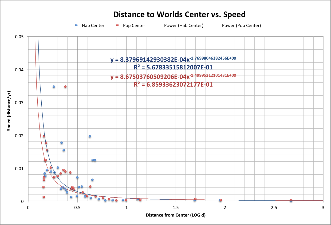 The speed that we move varies with how close we are to the centers, as shown below, along with curve fits suggesting that there is a defining relationship between distance and speed. |